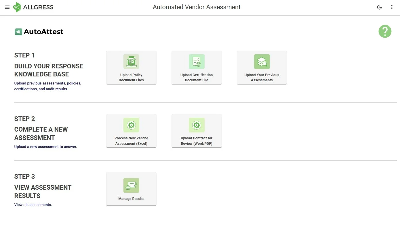 Upload any questionnaire or contract. AutoAttest reuses your policies, certifications, and past assessments to auto-answer, cite evidence, and map your gap-to-green plan.